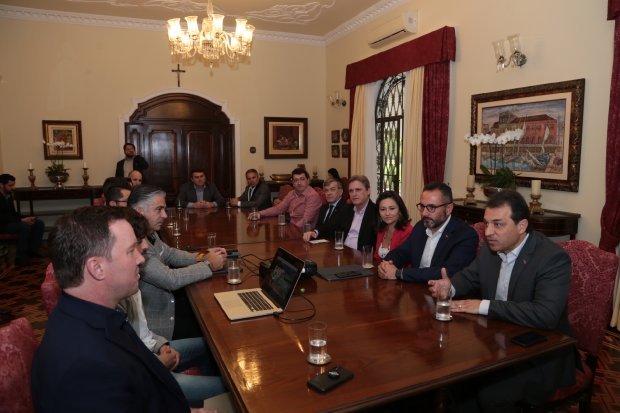 O presidente da Arena Petry, Sandro Petry, a presidente da Santur, Flavia Didomenico e o secretário de Articulação Internacional, Derian Campos, participaram da reunião, assim como o senador Dario Berger.